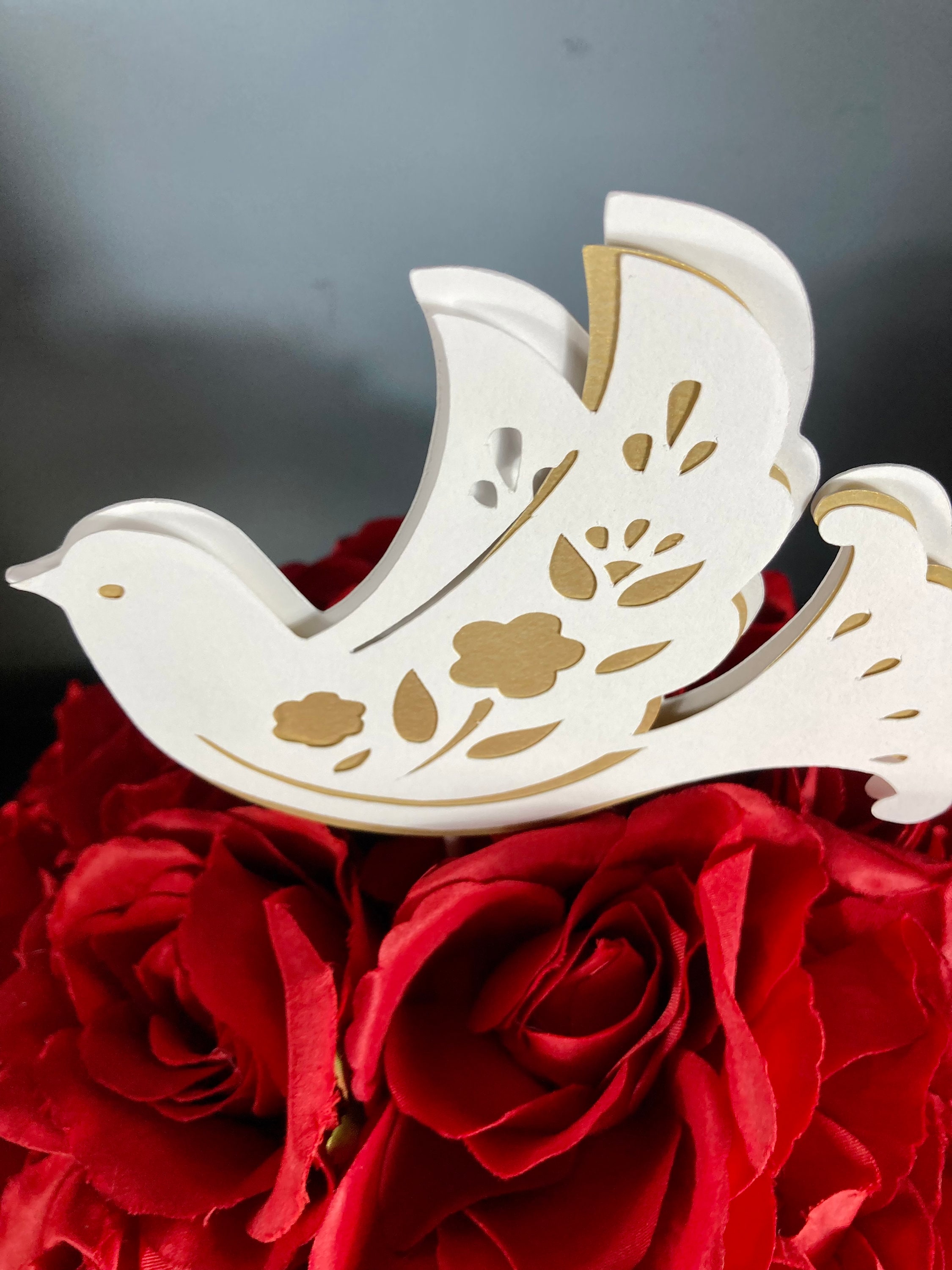 A beautiful laser cut dove in white and gold comes with it.