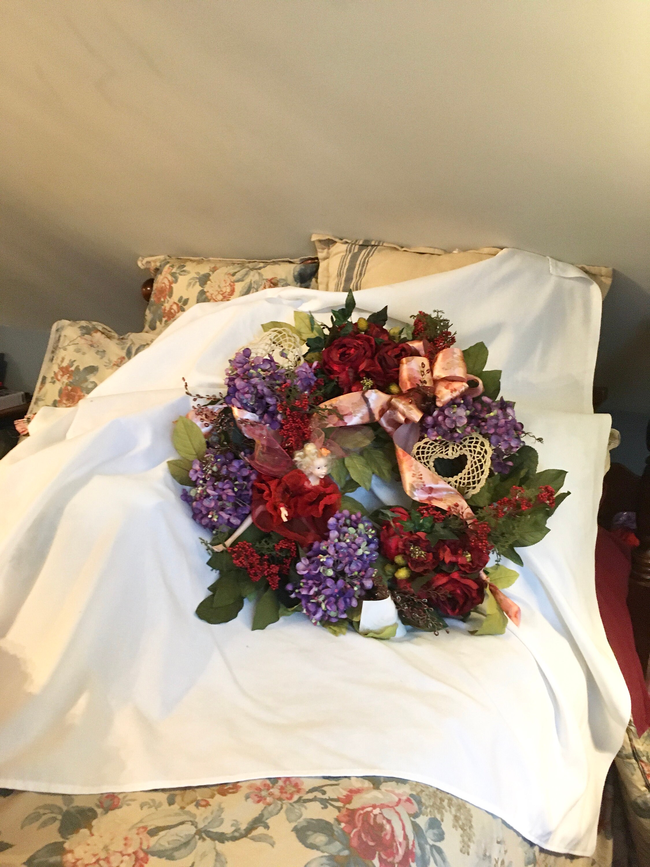 In the center of this stunning wreath sits a red magical Valentine Fairy. The wreath is embellished the crocheted doily hearts and glistening bead sprays.