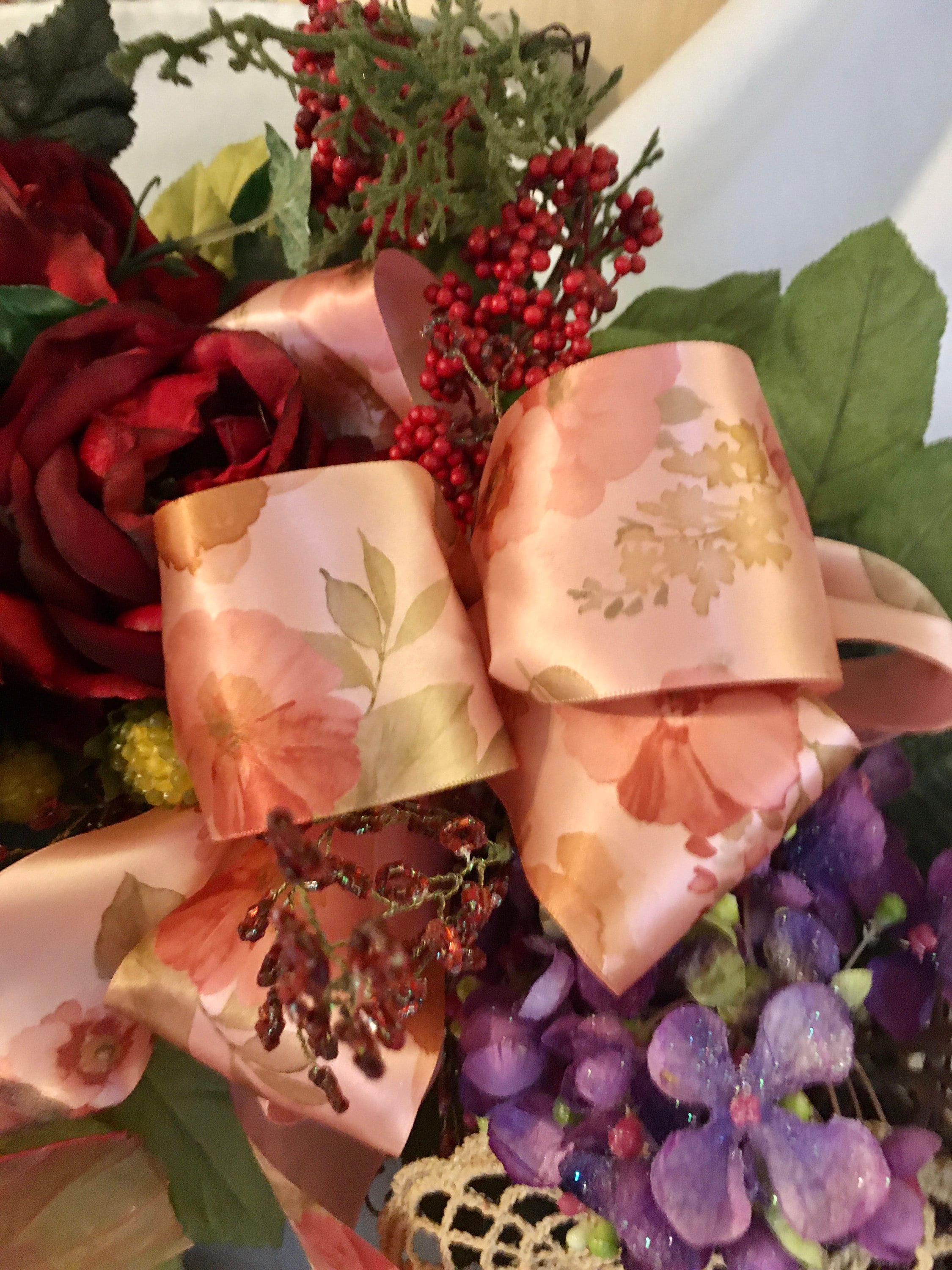 Silk Satin printed ribbon bow accents the real look silk flowers.