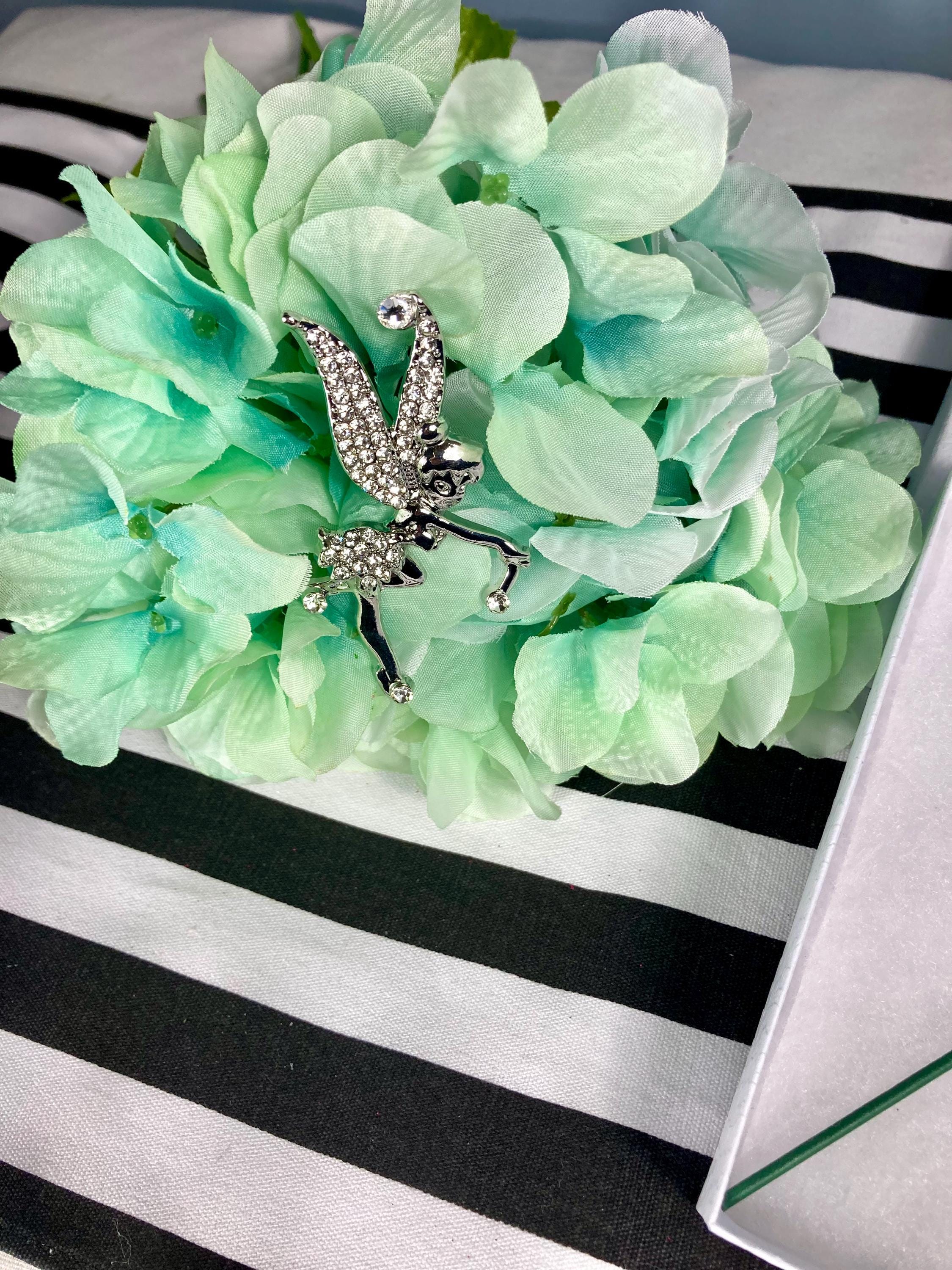 Tinker Bell is silver metal with tiny faceted clear rhinestones to add a magical sparkle to any event.