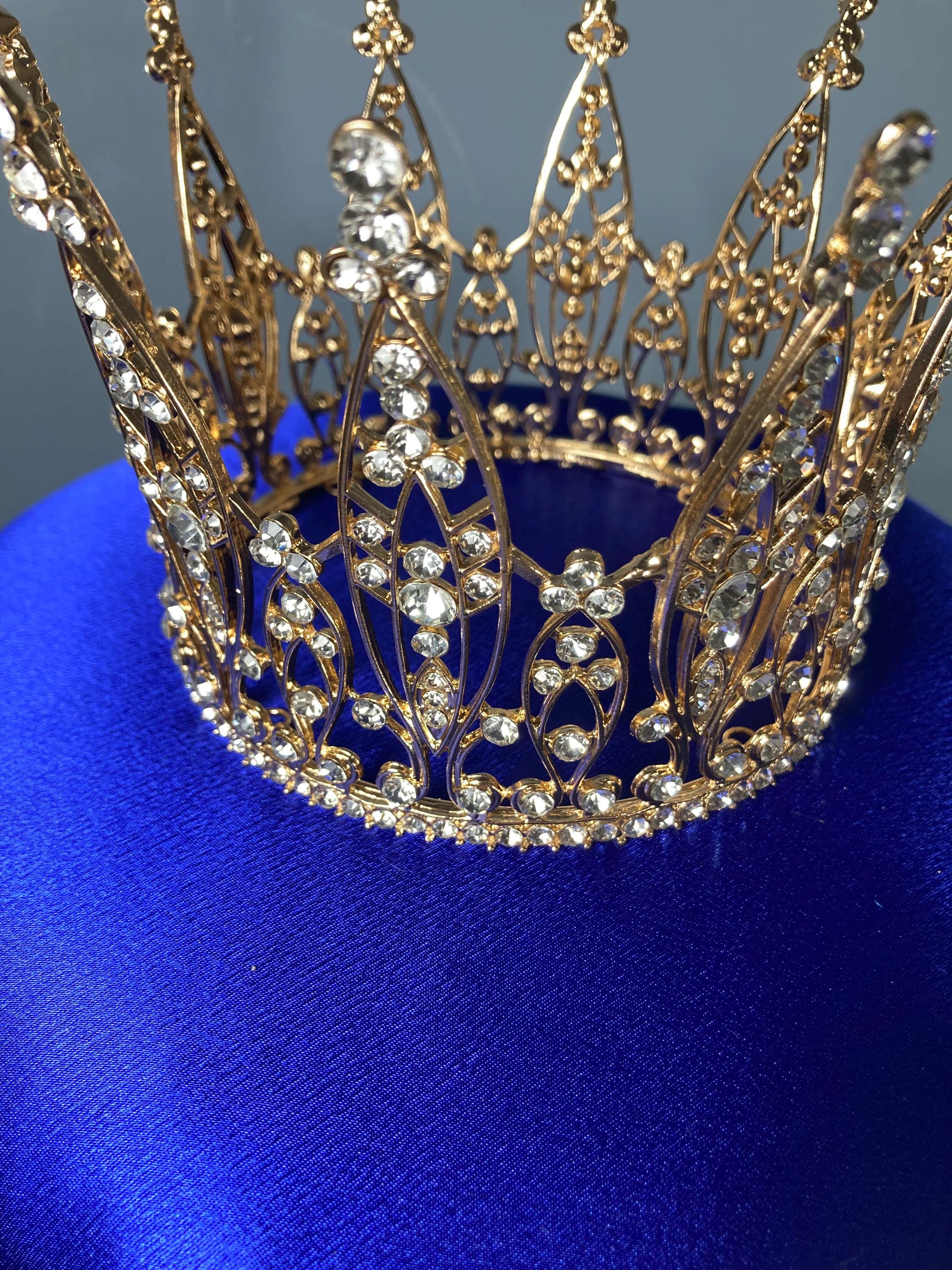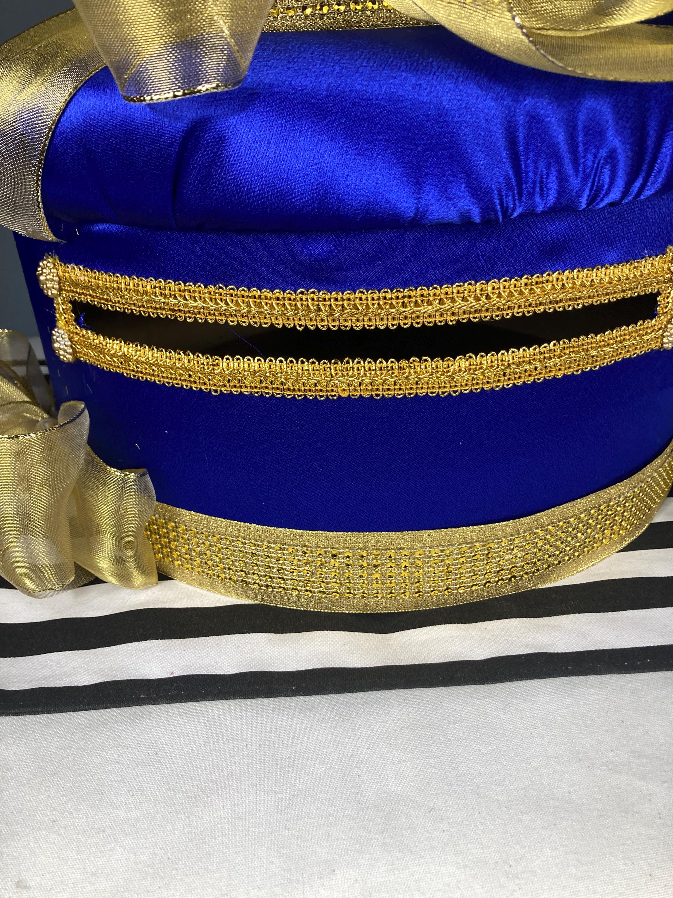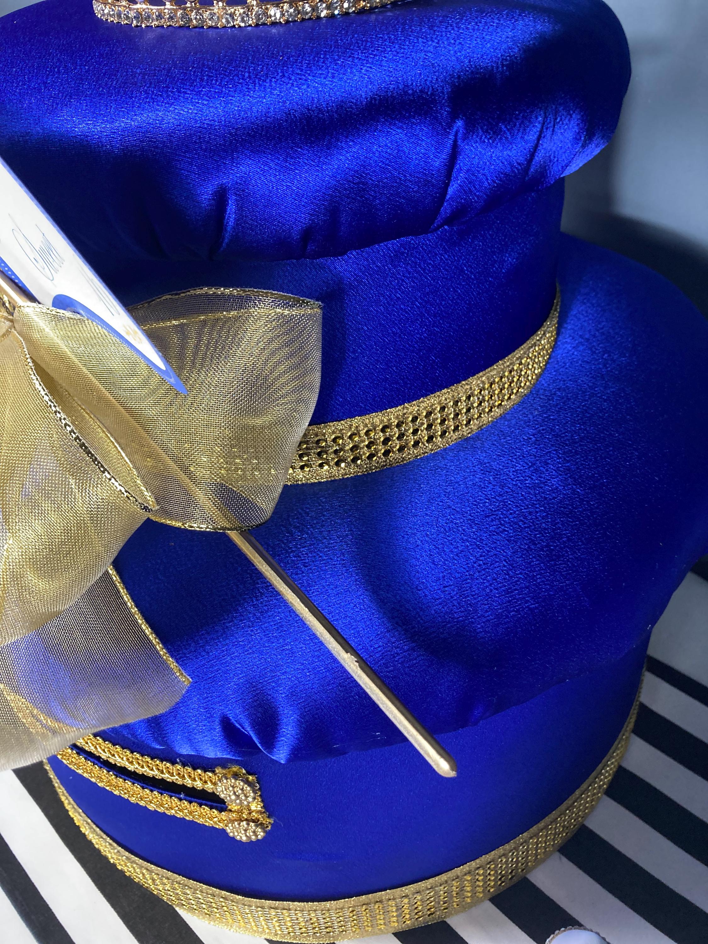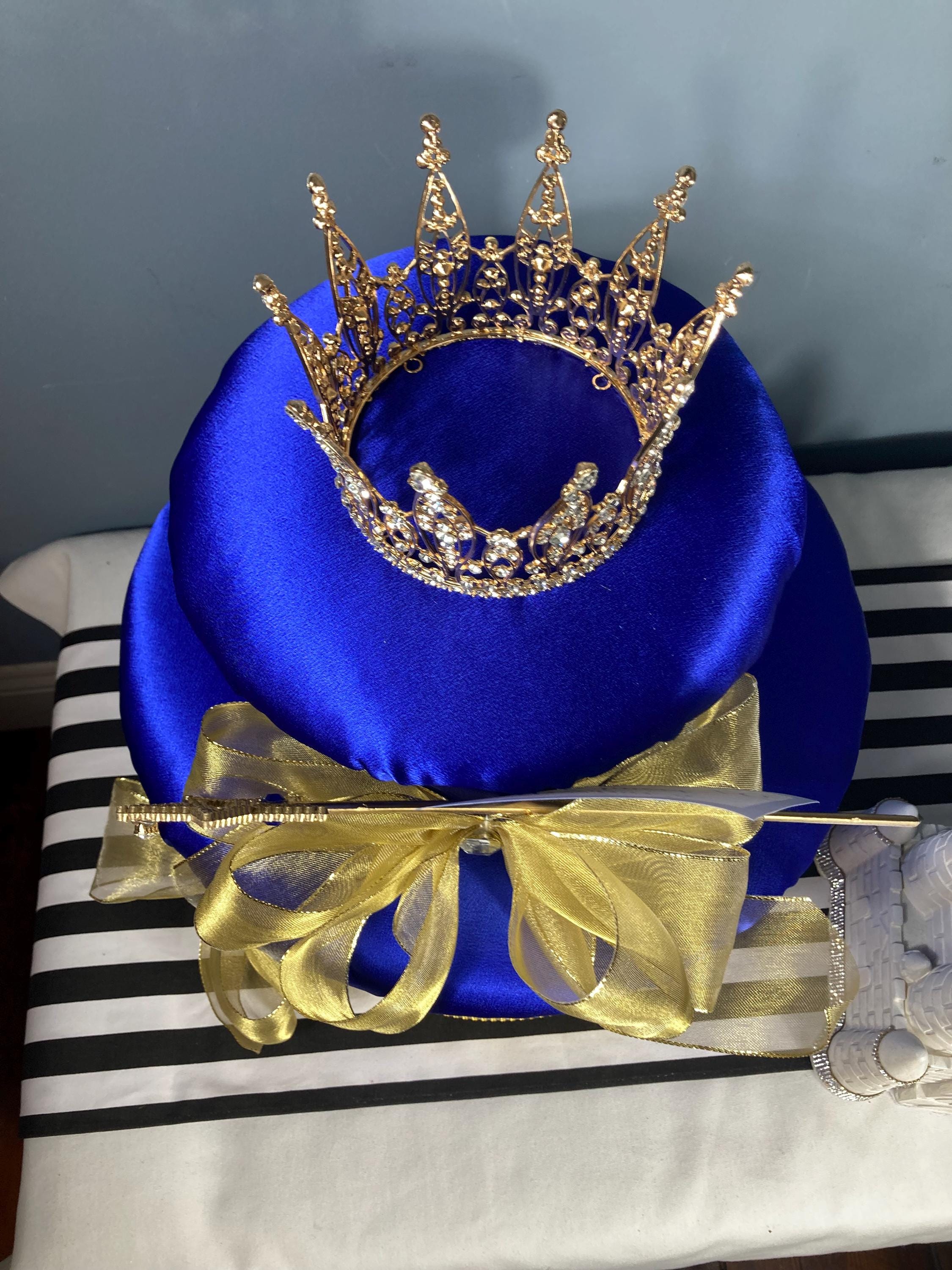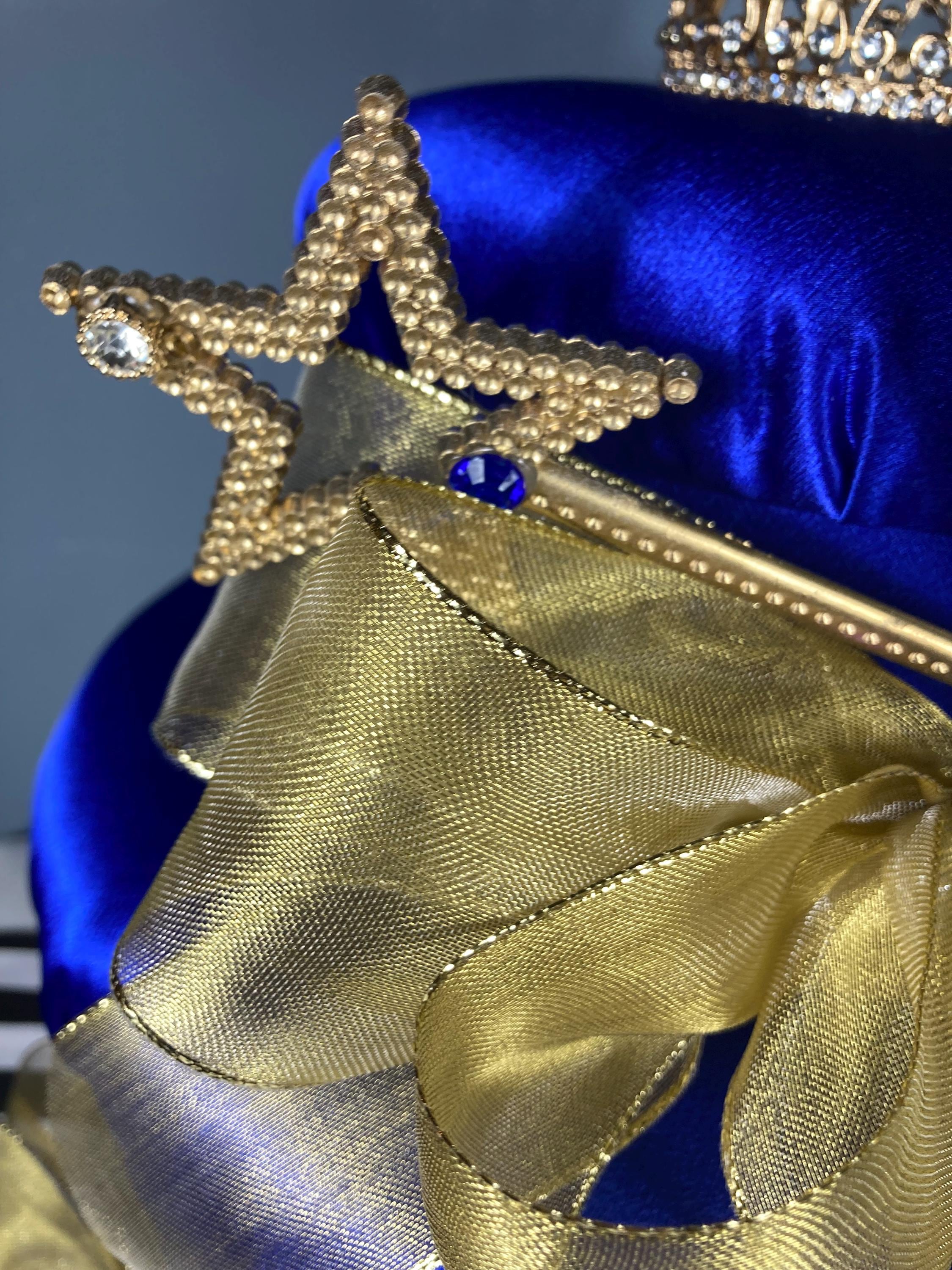 Crafted in rich royal blue satin fabric and accented with shimmering gold ribbons, this stunning piece is crowned with a sparkling gold metal rhinestone crown approx. (5 1/2" widest point x 4 1/8" tall) and dazzling star-tipped fairy wand.