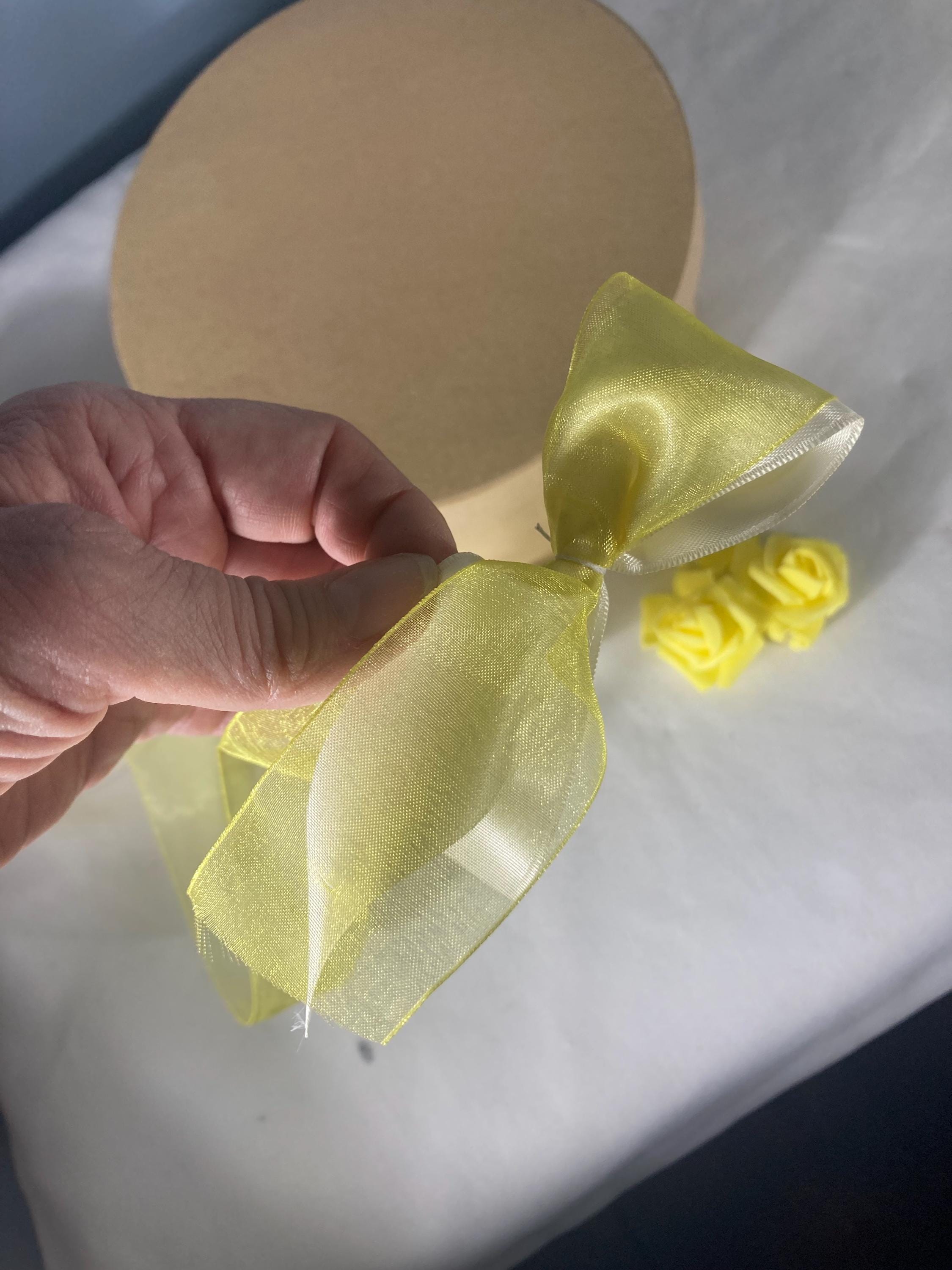 Silver innersole yellow sheer overlay over ivory ribbon bow in back of shoe