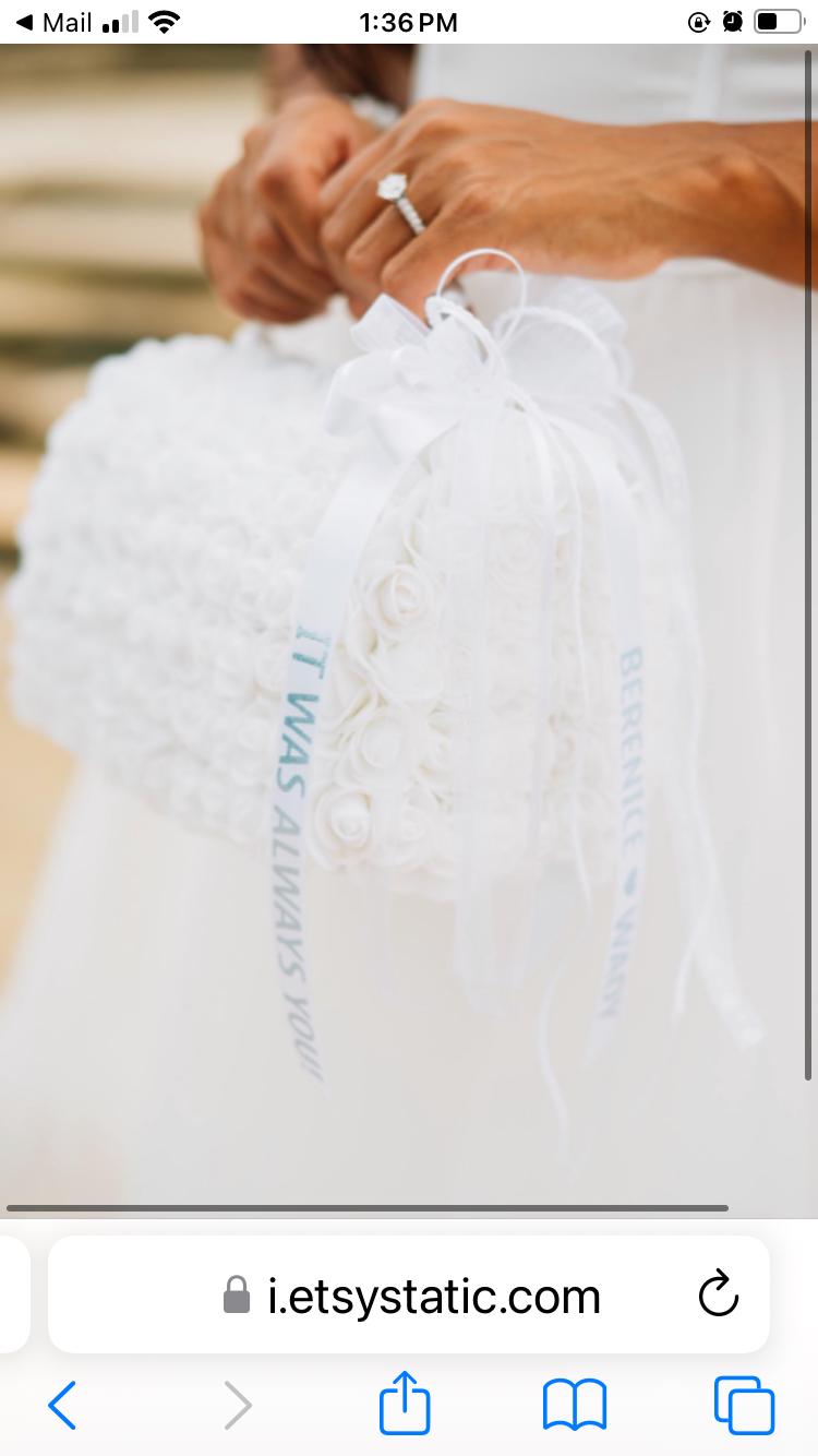 The handle of the purse is made of pearls and each has a satin and sheer streamer bow with rhinestone cross in the center to give twinkle to your bouquet.