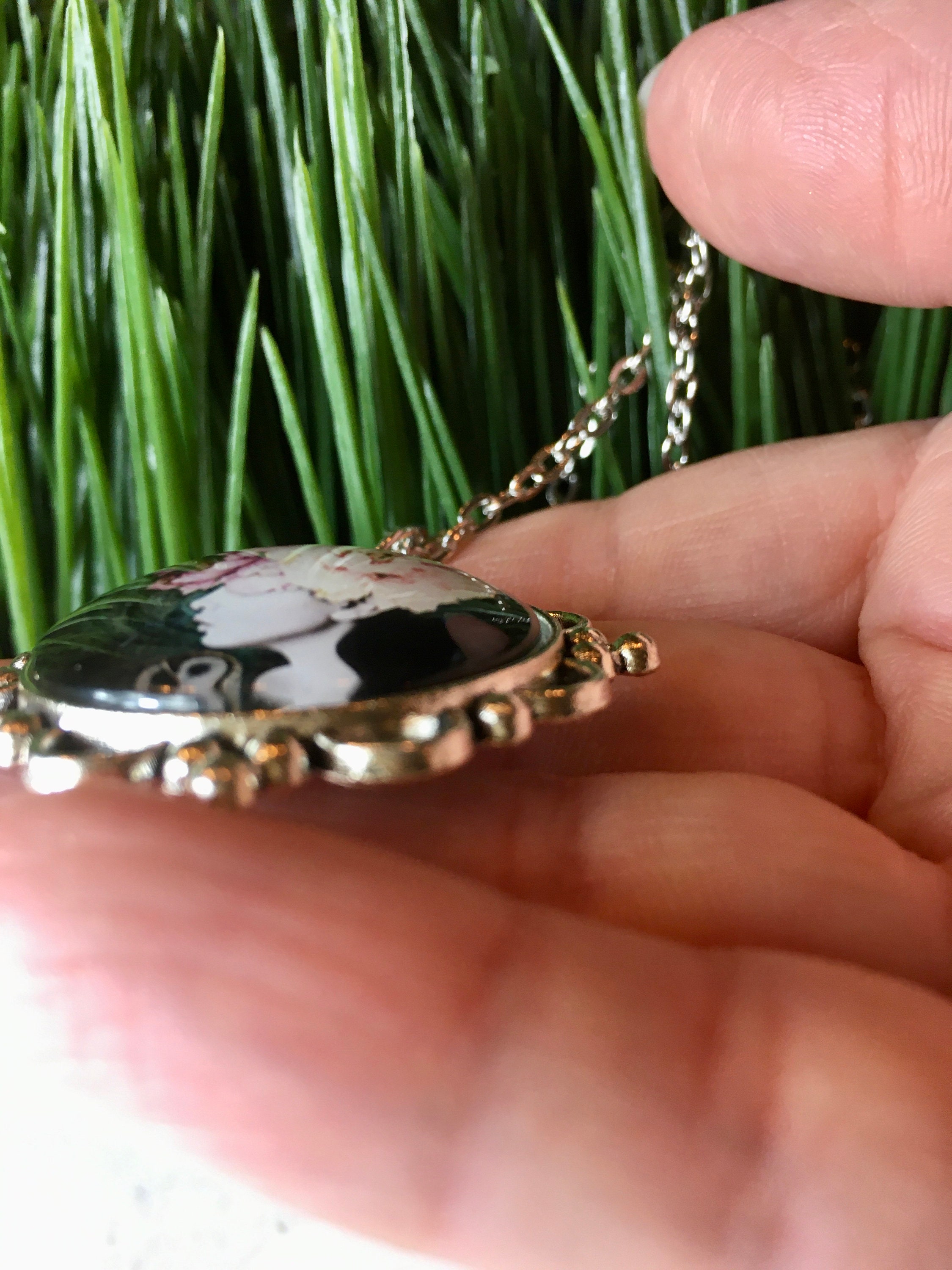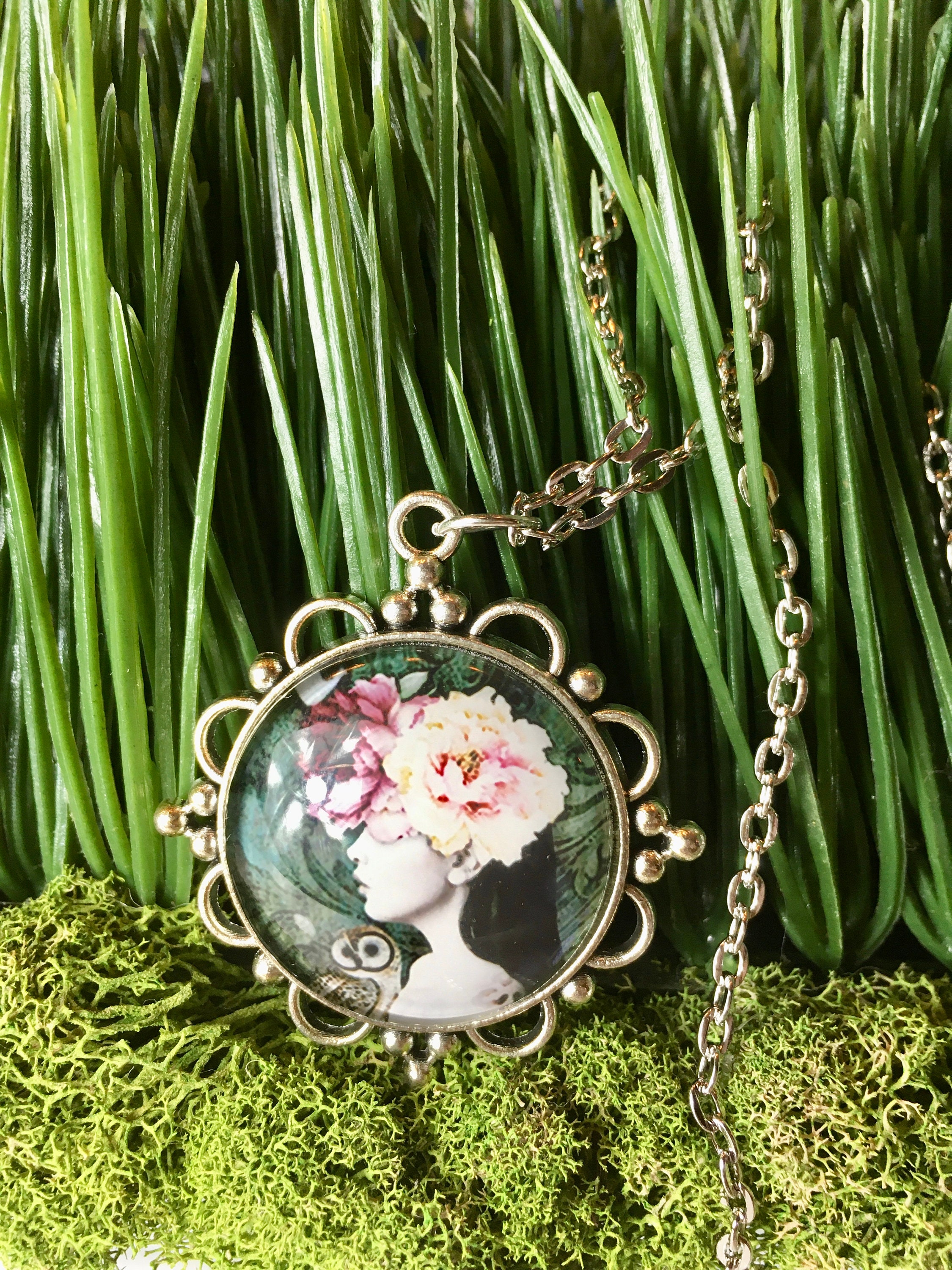 This fashionable necklace is sure to be a favorite for who love fashion. Each piece is created from vintage illustrations