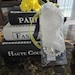 Each book box is covered in faux leather/vinyl fabric and embellished with rhinestone and pearl trim, along with the names Paris, Fashion and Haute Couture. The boxes are glued together. Sizes are small 6 x 4 x 1 1/2", medium 7 1/2 x 5 x 2", large 9" x 6 x 2 1/2". Each name is printed on card stock.