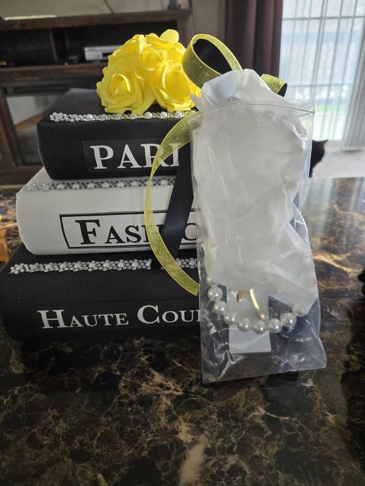 I'm in love with this new idea I came up with. This centerpiece measures approx. 9 1/2" Tall x 9" length and 6" wide. Each paper mache book is a box that can store small items such as jewelry, makeup, hair clips, nail polish and so much more. Please see video to see how they open.